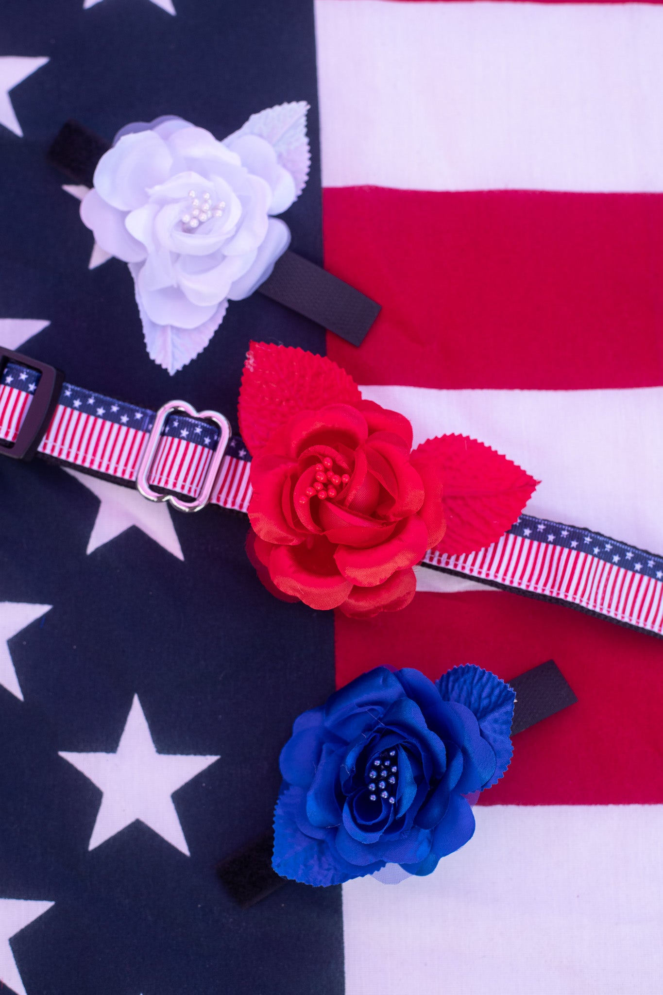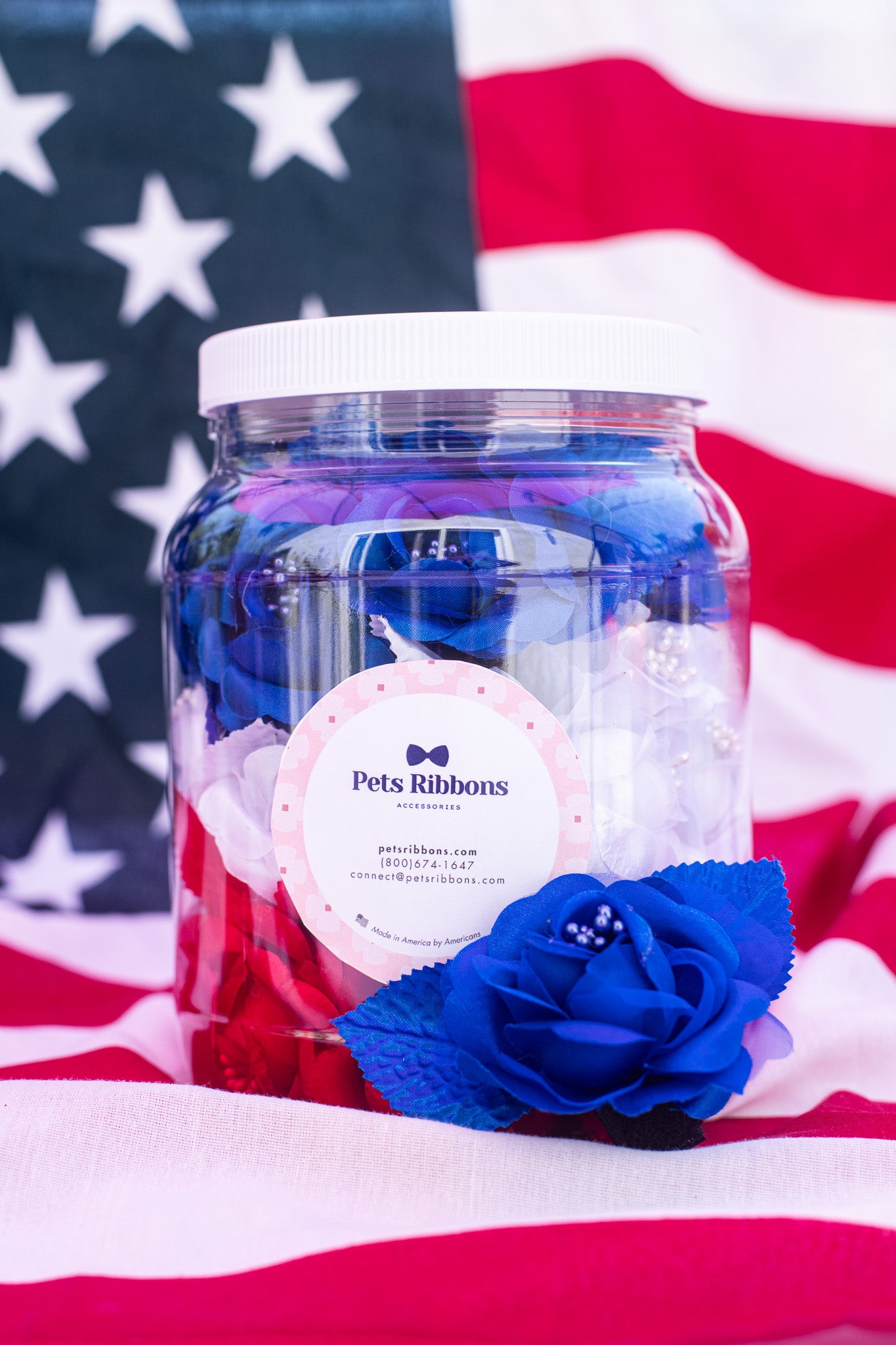 Freedom Flowers bring a patriotic touch to every pup. These red, white, and blue flowers feature a Velcro backing for easy, adjustable attachment to collars of any size. Conveniently packed in groomer jars, they're a festive and functional addition to your grooming setup.